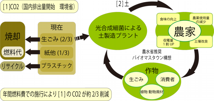 現在行われている廃旧製品のリサイクル事業から、NSB光合成細菌を用いた生ゴミの再生事業への転換を図ることにより、これまでの膨大なゴミ焼却燃料費用を削減できる上、CO2排出量の大幅削減や生ゴミの有効堆肥へ変換も可能。